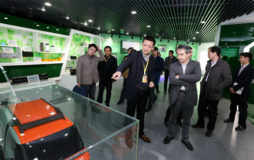 楊新新總裁向吳勝豐副主任介紹集團新能源產品研發制造情況