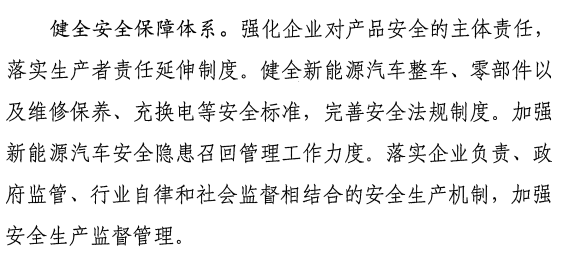 《征求意見稿》提出,強化企業(yè)對產(chǎn)品安全的主體責(zé)任,落實生產(chǎn)者責(zé)任延伸制度。健全新能源汽車整車、零部件以及維修保養(yǎng)、充換電等安全標準,完善安全法規(guī)制度。加強新能源汽車安全隱患召回管理工作力度。落實企業(yè)負責(zé)、政府監(jiān)管、行業(yè)自律和社會監(jiān)督相結(jié)合的安全生產(chǎn)機制,加強安全生產(chǎn)監(jiān)督管理。