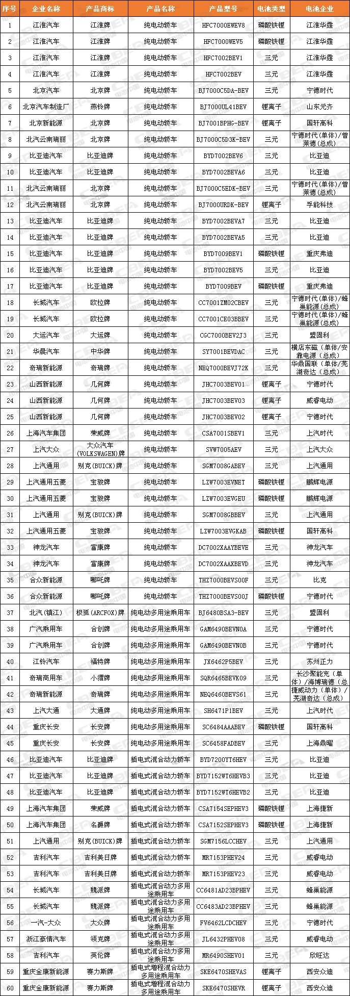 2020年1月15日,國家工信部在其官方網站發布了《道路機動車輛生產企業及產品公告》(第328批)的車輛新產品公示。本批新車公示中,申報新能源汽車產品的共222款車型,其中新能源乘用車和新能源客車產品數量相同,各有60款;新能源專用車產品有102款。動力電池應用分會研究部對其中的新能源乘用車及其配套動力電池情況進行了梳理,詳情如下:從申報車型品牌看,本次申報的60款新能源乘用車車型來自28個品牌。其中,比亞迪牌申報車型數量最多,達10款;其次是北京牌,申報5款;江淮汽車排名第三,申報4款。另外,查閱以往數據發現,本次申報的品牌中合創牌、極狐(ARCFOX)牌、小猬牌、英倫牌等4個品牌是首次申報公告。其中,合創牌車型有2款,分別是GAM6490BEVN0A和GAM6490BEVN0B純電動多用途乘用車,搭載寧德時代的三元電池。其他3個品牌各自申報1款車型,分別是極狐(ARCFOX)牌BJ6480BSA3-BEV純電動多用途乘用車,搭載盟固利的三元電池;小猬牌SQR6465BEVK09純電動多用途乘用車,搭載三元電池的電芯企業為長沙聚能充,電池系統企業為海博瑞德;英倫牌MR6490SHEV01插電式混合動力多用途乘用車,搭載欣旺達的三元電池。從電池技術路線看,三元電池仍是主流,有41款,占比68.3%;磷酸鐵鋰電池有11款,未注明類別鋰離子電池有8款。從配套動力電池企業看,本次共有29家(含組合)動力電池企業為60款新能源乘用車車型提供配套。其中,配套車型數量排名靠前的電池企業為寧德時代配套11款、比亞迪配套8款、蜂巢能源/江淮華霆/威睿電動各自配套4款,其他企業配套數量均在3款及以下。值得一提的是,本次配套電池企業中同樣出現了新面孔--重慶弗迪鋰電池有限公司(簡稱重慶弗迪),據悉,重慶弗迪為比亞迪旗下子公司,此次為比亞迪牌BYD7009BEV和BYD7009BEV1純電動轎車配套的2款磷酸鐵鋰電池是其開發的新一代磷酸鐵鋰電池——即被業界所關注的“刀片電池”,可使新車續航達500-600km,媲美目前多數的三元乘用車。以下為第328批新車公示中新能源乘用車車型動力電池配套情況: