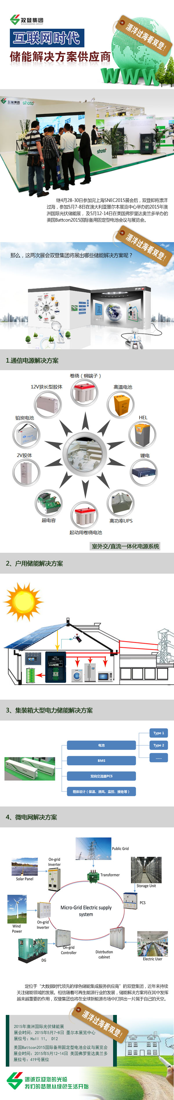 繼4月28-30日參加完上海SNEC2015展會后,雙登即將漂洋過海,參展5月7-8日在澳大利亞墨爾本展覽中心舉辦的2015年澳洲國際光伏儲能展,及5月12-14日在美國弗羅里達奧蘭多舉辦的美國Battcon2015國際備用固定型電池會議與展覽會,雙登集團竭誠歡迎您的光臨。