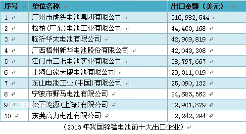 2013年,廣州市虎頭電池集團(tuán)有限公司、松柏(廣東)電池工業(yè)有限公司、臨沂華太電池有限公司等企業(yè)鋅錳電池出口量排在前三位,鋅錳電池出口前十大企業(yè)出口金額總計(jì)達(dá)到609,425,392美元。
