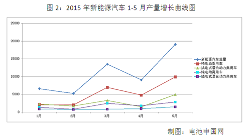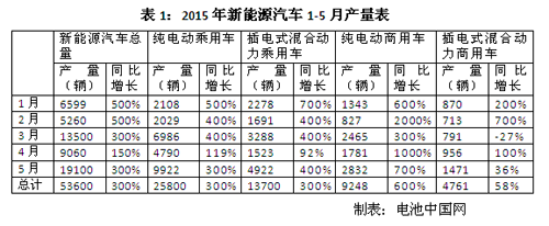 2015年1-5月,新能源汽車累計生產5.36萬輛,同比增長近3倍。其中,純電動乘用車生產2.58萬輛,同比增長近3倍;插電式混合動力乘用車生產1.37萬輛,同比增長3倍;純電動商用車生產9248輛,同比增長近6倍;插電式混合動力商用車生產4761輛,同比增長58%。