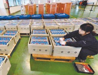 近日,在中航鋰電(洛陽)有限公司的生產流水線上,技術人員正在制造大容量鋰離子電池。這些電池將被組裝成儲能電池柜。