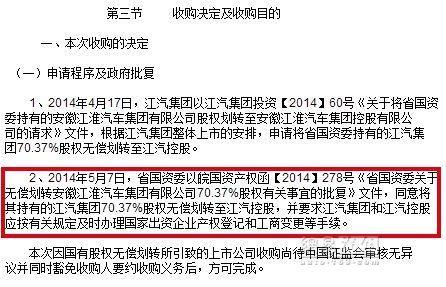 江淮汽車(chē)也同時(shí)發(fā)布關(guān)于收到控股股東《關(guān)于安徽江淮汽車(chē)集團(tuán)有限公司股權(quán)劃轉(zhuǎn)的通知》的提示性公告2014年5月15日公司收到控股股東江汽集團(tuán)《關(guān)于安徽江淮汽車(chē)集團(tuán)有限公司股權(quán)劃轉(zhuǎn)的通知》),根據(jù)安徽省國(guó)資委(皖國(guó)資產(chǎn)權(quán)函【2014】278號(hào))《省國(guó)資委關(guān)于無(wú)償劃轉(zhuǎn)安徽江淮汽車(chē)集團(tuán)有限公司70.37%股權(quán)有關(guān)事宜的批復(fù)》,安徽省國(guó)資委將其持有江汽集團(tuán)70.37%的股權(quán)無(wú)償劃轉(zhuǎn)至安徽江淮汽車(chē)集團(tuán)控股有限公司(簡(jiǎn)稱“江汽控股”)。本次股權(quán)劃轉(zhuǎn)行為完成后,江汽控股通過(guò)江汽集團(tuán)間接持有公司35.43%的股份,公司的實(shí)際控制人未發(fā)生變化,仍為安徽省國(guó)資委。