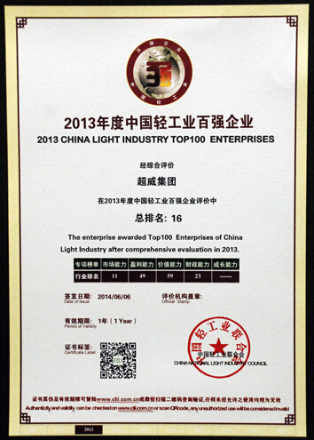 超威集團(tuán)在2013年度中國輕工業(yè)百強(qiáng)企業(yè)評(píng)價(jià)中總排名第16位