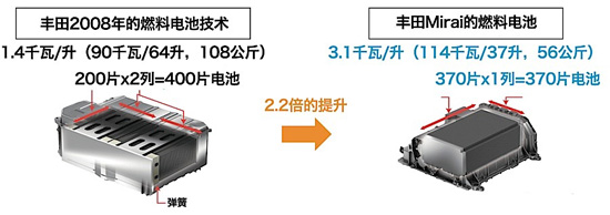 豐田設計了一大一小兩個儲氫罐,通過高壓的方式盡可能多充入一些氫氣。以目前的主流儲存技術,豐田選用了700Mpa也就是700個大氣壓的高壓儲氣罐,類似我們常見的“煤氣罐”,只不過罐體更厚重。兩個儲氫罐一共的容量是122.4升,采用700個大氣壓儲存,也只能容納約5公斤的氫氣。所以實際上燃料的重量并不大,反而儲氫罐特別笨重。