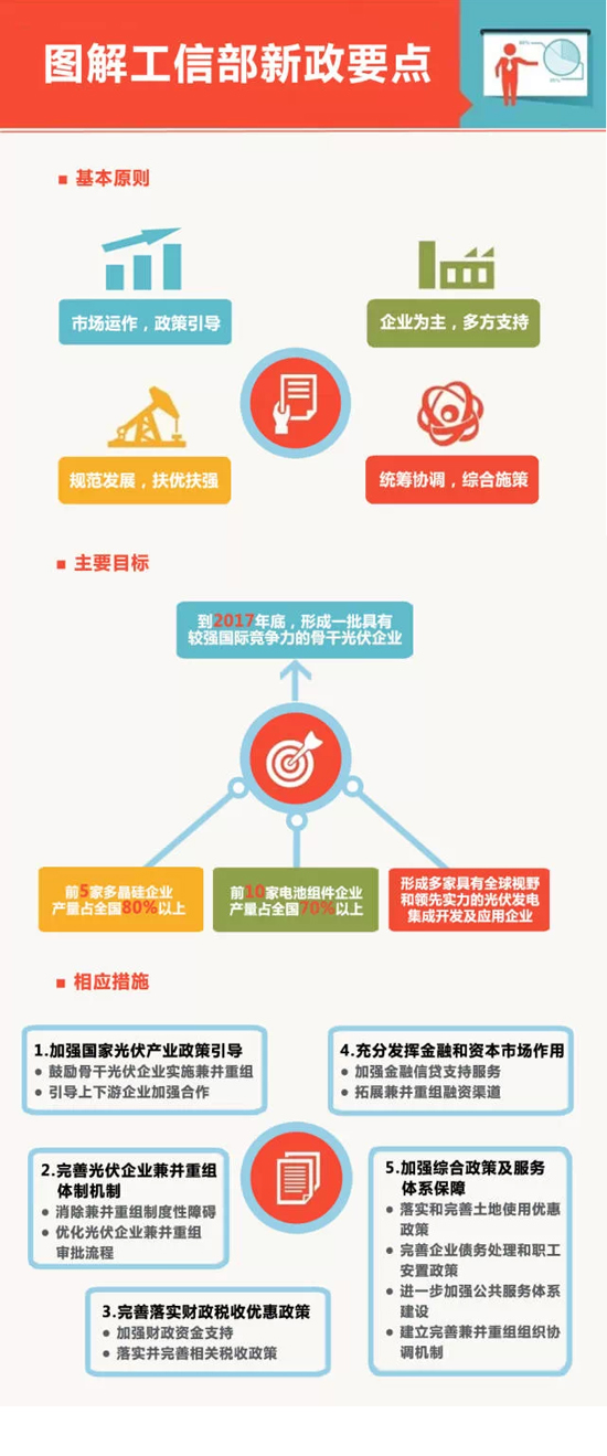 原文件略長(zhǎng),小編十分貼心的想到大家都是無(wú)耐心星人,所以特制了一張圖來(lái)分解意見(jiàn)中的要點(diǎn)。小伙伴們看下圖即可輕松讀懂長(zhǎng)篇政策。有耐心的小伙伴兒請(qǐng)戳此鏈接查看新政全文:《工信部關(guān)于進(jìn)一步優(yōu)化光伏企業(yè)兼并重組市場(chǎng)環(huán)境的意見(jiàn)》。