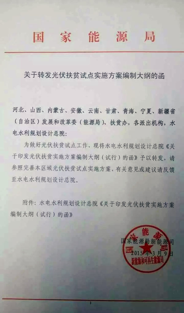 為持續(xù)推進(jìn)、完善光伏扶貧工作進(jìn)展,2015年3月9日,國(guó)家能源局新能源司下發(fā)《關(guān)于轉(zhuǎn)發(fā)光伏扶貧試點(diǎn)實(shí)施方案編制大綱的函》,為各地編制光伏扶貧實(shí)施方案提供參考依據(jù)。