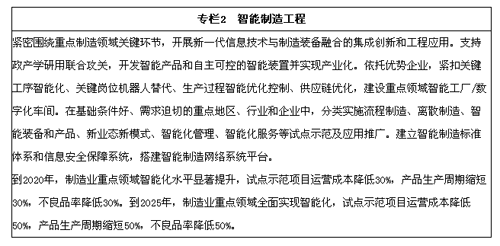 加快發(fā)展智能制造裝備和產(chǎn)品。組織研發(fā)具有深度感知、智慧決策、自動(dòng)執(zhí)行功能的高檔數(shù)控機(jī)床、工業(yè)機(jī)器人、增材制造裝備等智能制造裝備以及智能化生產(chǎn)線,突破新型傳感器、智能測(cè)量?jī)x表、工業(yè)控制系統(tǒng)、伺服電機(jī)及驅(qū)動(dòng)器和減速器等智能核心裝置,推進(jìn)工程化和產(chǎn)業(yè)化。加快機(jī)械、航空、船舶、汽車、輕工、紡織、食品、電子等行業(yè)生產(chǎn)設(shè)備的智能化改造,提高精準(zhǔn)制造、敏捷制造能力。統(tǒng)籌布局和推動(dòng)智能交通工具、智能工程機(jī)械、服務(wù)機(jī)器人、智能家電、智能照明電器、可穿戴設(shè)備等產(chǎn)品研發(fā)和產(chǎn)業(yè)化。