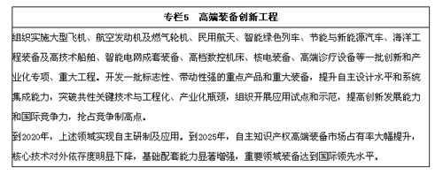 航空裝備。加快大型飛機(jī)研制,適時啟動寬體客機(jī)研制,鼓勵國際合作研制重型直升機(jī);推進(jìn)干支線飛機(jī)、直升機(jī)、無人機(jī)和通用飛機(jī)產(chǎn)業(yè)化。突破高推重比、先進(jìn)渦槳(軸)發(fā)動機(jī)及大涵道比渦扇發(fā)動機(jī)技術(shù),建立發(fā)動機(jī)自主發(fā)展工業(yè)體系。開發(fā)先進(jìn)機(jī)載設(shè)備及系統(tǒng),形成自主完整的航空產(chǎn)業(yè)鏈。
