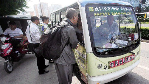 因電瓶車存在無照運營以及安全問題,近日,朝陽區多個街道的社區擺渡車突然被叫停,但其他區縣街道為保證市民出行便利,仍在開行擺渡車。北京市交通委11日透露,北京將力爭在年底推出6米長可以刷卡消費的“超袖珍”電動公交,解決社區擺渡車問題。