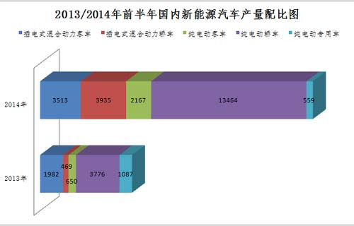 2014年上半年國內(nèi)新能源車型產(chǎn)量共計23638輛,同比2013年上半年增長率近200%,新一輪示范推廣補貼政策帶來的市場推動效果顯而易見。其中插電式混合動力車型共計生產(chǎn)7448輛,同比增長超過200%,包括插電式混合動力乘用車3935輛,插電式混合動力客車3513輛;純電動車型產(chǎn)量16190輛(含鉛酸電池車型3765輛),同比增長194%,包括純電動乘用車13464輛,純電動客車2167輛,純電動專用車559輛。