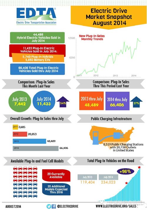 據(jù)美國華盛頓的電動交通協(xié)會近日公布的在美電動車市場銷售數(shù)據(jù)顯示,七月份上路行駛的插電式電動車總量同比去年增長了96%。插電式電動汽車從2010年末到2013年7月共計(jì)銷售119,404輛。從那時(shí)起到2014年7月,共售出114,619輛插電式電動車,使銷售總量達(dá)到了234,023。