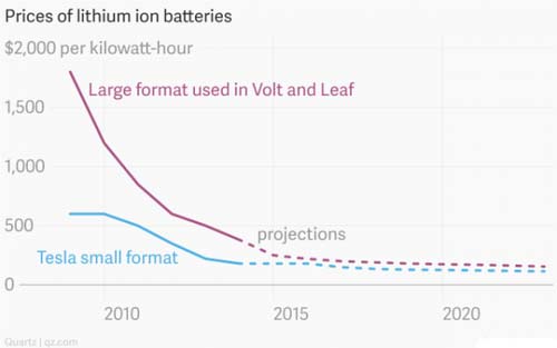 Musk的電池成本已經比其他廠商要低了,這是因為包括通用在內的制造商都是“白手起家”,不得不使用“袋狀”或是金屬矩形電池,而特斯拉采用的是松下的高容量電池,而這款電池的價格在過去二十年里持續走低。松下“18650”電池比普通AA電池略大,每千瓦時成本約200到300美元,前文提到的尼桑的成本是380美元每千瓦時。