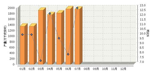 根據(jù)國(guó)家統(tǒng)計(jì)局公布數(shù)據(jù),全國(guó)鉛酸蓄電池行業(yè)累計(jì)完成產(chǎn)量12,746.11萬(wàn)千伏安時(shí),同比增長(zhǎng)9.66%。其中:7月份完成產(chǎn)量1950.88萬(wàn)千伏安時(shí),同比增長(zhǎng)12.99%。2014年全國(guó)鉛酸蓄電池行業(yè)月度產(chǎn)量及同比如下圖所示。