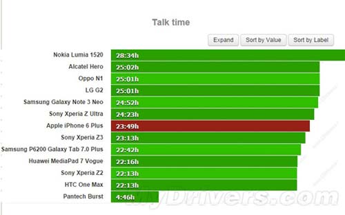 另外gsmarena表示在其大屏智能手機續航數據庫中,iPhone 6 Plus的續航表現可以排名前十。