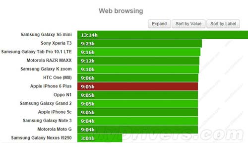 網頁瀏覽方面,iPhone 6 Plus能堅持9小時5分鐘,表現和HTC M8、iPhone 5C以及Galaxy Note 3等差不多,但并不算太高。