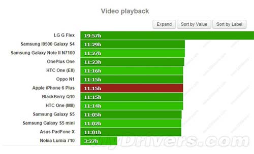 視頻播放測試中,iPhone 6 Plus能堅持11小時15分鐘,表現和HTC One時尚版類似,略強于Galaxy S5。