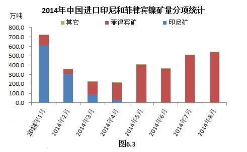據海關數據統計,8月份中國鎳礦進口總量為542萬噸,比上月增加35萬噸,同比增加17萬噸;其中,從菲律賓進口量為532萬噸,比上月增加32萬噸,同比增加247萬噸;從印尼進口量為3.8萬噸,比上月增加0.3萬噸,同比減少232萬噸。相比6月份的359萬噸、7月份的501萬噸,8月菲律賓鎳礦進口量可謂連連增加(圖6.3)。