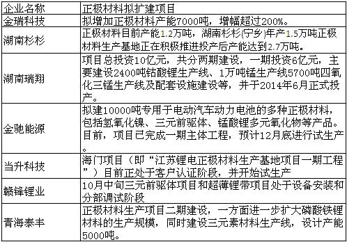新能源汽車市場的蓄勢待發,正誘惑鋰電正極材料領域掀起新一輪的擴產熱潮。截止到2013年,中國正極材料生產企業已達200多家。2014年下半年正極材料即將擴產或投產的公司統計如下: