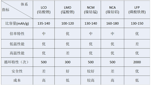 表1:磷酸鐵鋰與其他主要鋰離子電池性能對(duì)比