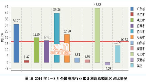 2014年1~8月全國電池行業利潤增長較快的地區是河北、江西、廣東、河南、湖北、江蘇地區。(參見圖10)