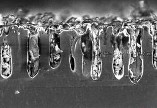 這個(gè)神奇的結(jié)構(gòu)就是納米孔,麻雀雖小,五臟俱全。在陶瓷片層上一個(gè)納米級別的小孔內(nèi)盛放電解質(zhì),電解質(zhì)能在孔兩端的納米管電極之間傳輸電荷。目前的裝置還只是一個(gè)測試,但測試中這枚小個(gè)頭的電池表現(xiàn)良好。論文第一作者劉嬋媛(音譯)是馬里蘭大學(xué)材料科學(xué)與工程系研究生,她表示,小電池在12分鐘內(nèi)就能充滿電,而且能夠反復(fù)充電上萬次。