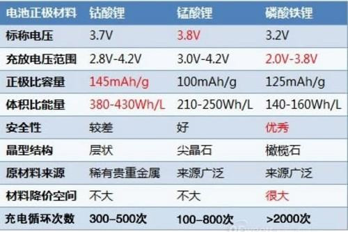 下表為磷酸鐵鋰電池和錳酸鋰、鈷酸鋰電池的幾個比較明顯的數(shù)據(jù)對比,主要通過標稱電壓、充放電壓范圍、體積比能量等幾大方面進行對比。
