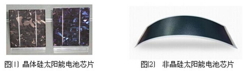 柔性非晶硅太陽能電池軟性、透明、細?。s為1微米之厚度),太陽能光電模塊原件(見圖②)呈片狀,其制造技術已完全成熟量產,每一KW所需硅材僅0.067公斤,而其對高頻日照光譜(藍色)最為敏感。