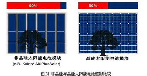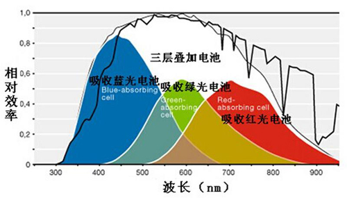 柔性非晶硅太陽能電池中嵌有三層硅晶體,粘附在不銹鋼薄膜上,外覆醋酸乙烯乙烷聚合物(EVA)保護層。三層膜粘合可減薄每個子電子層的厚度,使每個子電池的內(nèi)電場增加,增加了各子電池的收集效率,擴展了光譜相應范圍。每一層硅晶體都能轉(zhuǎn)換可見光譜中的特定部分,從而即使在陰雨、多云天氣中也可提供較高的光電轉(zhuǎn)換率,彌補了非晶硅相對于多晶硅,單晶硅板在晴好天氣轉(zhuǎn)換率低的不足(晶體硅電池轉(zhuǎn)換效率在17%左右,非晶硅電池約為8-10%,轉(zhuǎn)換效率高主要體現(xiàn)在產(chǎn)品可節(jié)省一定受光面積,而總體功率不變)。