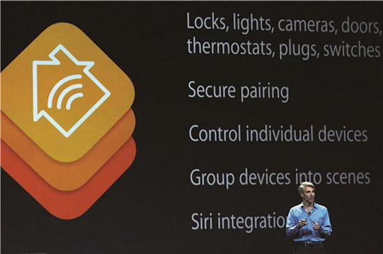 △ 蘋(píng)果智能家居。2014年6月,蘋(píng)果公司宣稱(chēng),最新設(shè)計(jì)的“HomeKit”智能家居平臺(tái)可實(shí)現(xiàn)通過(guò)智能手機(jī)遠(yuǎn)程控制,同時(shí),該平臺(tái)支持的產(chǎn)品線更為廣泛,例如:燈、門(mén)、溫度調(diào)節(jié)裝置、開(kāi)關(guān)。