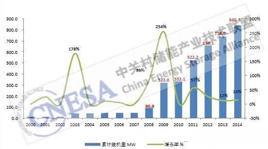 近年,儲能市場一直保持較快增長。據CNESA項目庫不完全統計,截至2014年底,全球儲能在電力系統的累計裝機總量(2000年-2014年累計量)為840.3MW(不包含抽蓄,壓縮空氣儲能及儲熱),年復合增長率(CAGR)達到135%。
