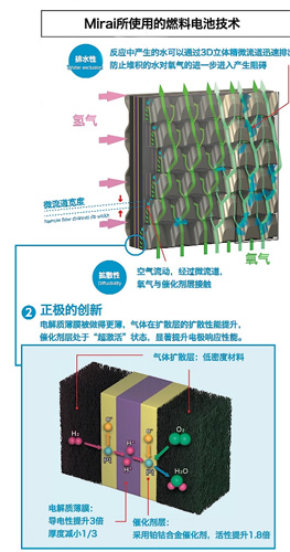 豐田Mirai搭載的燃料電池堆棧是由370片薄片燃料電池組成的,因此被稱為“堆棧”,一共可以輸出114千瓦的發電功率。此前我們也分析了大眾集團的燃料電池技術,結構基本類似。豐田的燃料電池堆棧經歷了十幾年的技術優化,形成了自己的特色結構,比如3D立體微流道技術,通過更好地排出副產物水,讓更多空氣流入,有效改善了發電效率。所以整個堆棧的發電效率達到了世界先進水平,達到了3.1千瓦/升,比2008年豐田的技術整整提升了2.2倍。