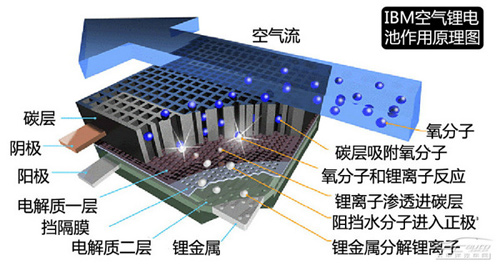 IBM空氣鋰電池的結構如圖所示,陽極為鋰金屬板,陰極為表面碳層,中間有兩層電解質,其中靠近鋰金屬電板一側的電解質負責接收由鋰金屬板釋放的鋰離子,而靠近碳層一側的電解質則負責把接收到的鋰離子更好地滲透至碳層。兩種電解質中間有阻擋膜,用以阻止不同層面物質之間的相互滲透與污染。