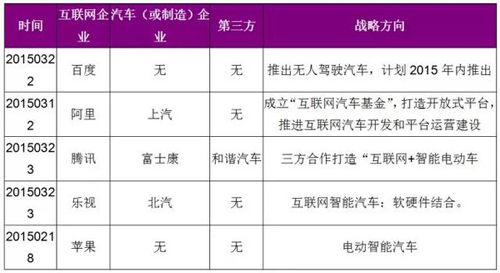多項 “汽車互聯(lián)化、智能化”項目已經(jīng)啟動。國內(nèi)互聯(lián)網(wǎng)龍頭BAT分別表示將進軍“無人駕駛、互聯(lián)網(wǎng)汽車、智能電動車”領域,將分別在硬件開發(fā)、平臺建設方面開展研發(fā)與投資。國內(nèi)的科技企業(yè)樂視、華為分別聯(lián)手主機廠打造軟硬件合一的智能信息化平臺。國際科技巨頭蘋果、谷歌則懷有更大產(chǎn)業(yè)魄力,志在未來5年內(nèi)制造出電動智能汽車和無人駕駛汽車。