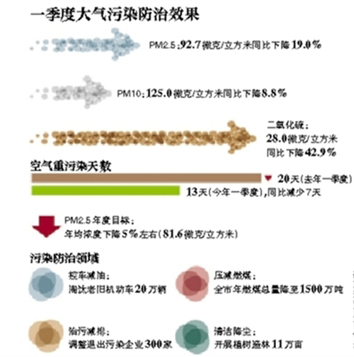 數(shù)據(jù)顯示,今年一季度,PM2.5累計濃度為92.7微克/立方米,同比下降19.0%;共發(fā)生空氣重污染13天,同比減少7天。