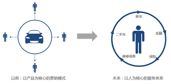 我們看汽車行業的互聯網化改變了什么。一個最根本的改變是目前以產品為核心的營銷模式,逐步的過渡到以人為核心的服務體系。一次性的銷售,讓金融、維修、二手車這塊形成一個整合的體系,這里面新車、保養、維修,有些是節點性的營銷閉環,或者獨立的營銷結點,有的就是鏈條式的。就像一個機器,有的是齒輪,有的鏈條,不承擔獨立的營銷任務。哪些是鏈條,哪些是節點,我們可以根據他們的這個屬性來看,不同的操作主體有不同的理解,我只是想大概談一下原理??偠灾?,我們要把這個產品的消費模式過渡到以人為服務的整體模式上來。