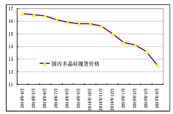 圖1 2014年4月-2015年4月國(guó)內(nèi)多晶硅現(xiàn)貨報(bào)價(jià)單位:萬(wàn)元/噸 來(lái)源:硅業(yè)分會(huì)