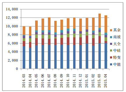 硅業(yè)分會(huì)統(tǒng)計(jì),2015年3-4月國(guó)內(nèi)多晶硅產(chǎn)量為2.6萬(wàn)噸,同比增加30.7%。3月份產(chǎn)量為1.34萬(wàn)噸,4月份產(chǎn)量為1.26萬(wàn)噸,其中江蘇中能的產(chǎn)量占國(guó)內(nèi)一季度總產(chǎn)量的46.2%,依舊位居國(guó)內(nèi)產(chǎn)量第一位,特變電工和洛陽(yáng)中硅分別居第二、三位,3-4月份前三大企業(yè)產(chǎn)量占總產(chǎn)量的62.8%。3-4月期間有兩家企業(yè)經(jīng)歷正常檢修,4月底均恢復(fù)正常生產(chǎn),故4月份產(chǎn)量受些許影響。目前17家在產(chǎn)企業(yè)中,開(kāi)工率達(dá)到100%的企業(yè)有8家,其余除檢修企業(yè)外均維持正常生產(chǎn)。