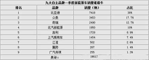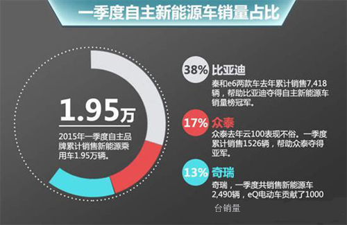 近日,乘聯(lián)會公布了今年一季度自主品牌的銷量,比亞迪獨(dú)占鰲頭,以7,418輛奪得冠軍。去年比亞迪全年新能源車銷量為1.8萬輛,而今年一季度就完成了去年總銷量的4成。在新能源銷量的前三甲中,眾泰以3,453輛位居第二讓人側(cè)目。排在第三位的是奇瑞,一季度共銷售新能源車2,490輛。緊隨其后的是北汽和吉利。北汽E系純電動車一季度累計(jì)銷售1950輛,是一季度銷量最高的純電動車。6—9名依次為上汽乘用車、江淮、騰勢、廣汽傳祺。對于下一階段的發(fā)展方面,各大車企均已有規(guī)劃。