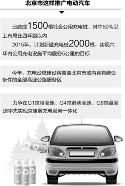 據介紹,充電設施建設的下一個重要目標是覆蓋高速公路服務區,進而與天津、河北溝通對接,實現京津冀充電服務一體化。2015年,北京市計劃新建充電樁2000根,實現本市六環內公用充電設施平均服務5公里的目標。目前已建成約200根,在建約1000根。