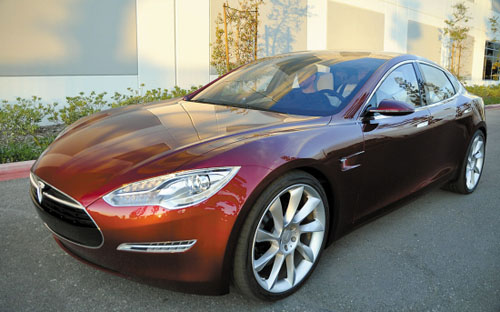 特斯拉電動汽車車頭上方墻面懸掛了Powerwall太陽能蓄電池。(自特斯拉)