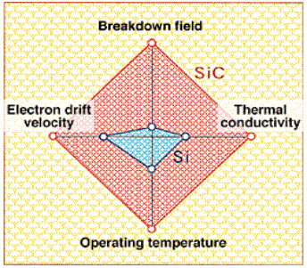 碳化硅物理特性與硅有很大不同。單晶碳化硅比單晶硅具有很多優(yōu)越的物理特性,例如大約10倍的電場強度、大約高3倍的熱導率、大約寬3倍禁帶寬度、大約高一倍的飽和漂移速度。除此之外,在具體的應用上,雖然碳化硅器件的工藝難度比單晶硅大很多,但是一旦解決工藝問題,碳化硅器件制造流程短,體積重量小、抗氧化壽命長、輸出功率高的特點,將使其成為遠優(yōu)于單晶硅的21世紀理想半導體材料。而且碳化硅材料對電力的能耗極低,按照如果年產(chǎn)40萬片碳化硅晶片襯底的計劃,僅僅應用在照明領域,每年減耗的電能就相當于節(jié)約2600萬噸標準煤,是一種理想的節(jié)能材料。