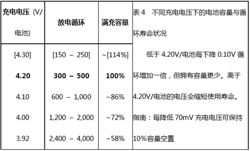 對于循環壽命來說,鋰離子電池的最佳充電電壓為3.92V。電池專家們相信這個臨界值消除了所有與電壓相關的不利影響,當低于該值時,可能會給電池帶來其他的不利影響。表4總結了不同充電水平下的電池容量狀況,所有數值均是估值。