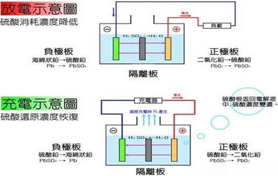 鉛酸電池是世界上應(yīng)用最廣泛的電池之一。鉛酸電池內(nèi)的陽極(PbO2)及陰極(Pb)浸到電解液(稀硫酸)中,兩極間會產(chǎn)生2V的電勢,這就是鉛酸電池的原理。經(jīng)由充放電,則陰陽極及電解液即會發(fā)生如下的變化: