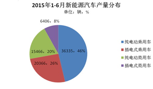 從車型分布來看,純電動乘用車仍是整個新能源汽車市場的主力車型,2015年上半年生產36355輛,占總體產量的45%。其次是插電式乘用車生產20366輛,占比26%。新能源乘用車整體占比由去年的65%提升了7個百分點,私人市場進一步擴大。