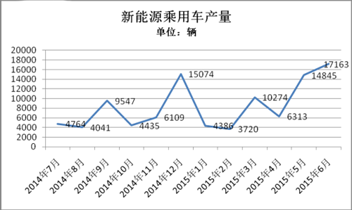 5月、6月的產量再次穩固了對新能源乘用車市場的信心。5月生產14845輛,環比增長135%;6月生產17163輛,環比增長15.6%。至此,新能源乘用車2015年1-6月累計生產5.67萬輛,已超過去年全年5.45萬輛的產量。