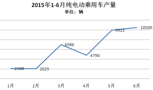 2015年1-6月,純電動乘用車生產3.63萬輛,接近去年全年3.78萬輛的產量,同比增長3倍。