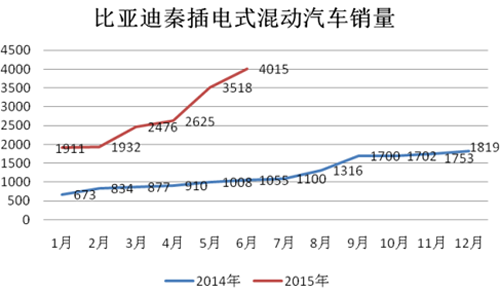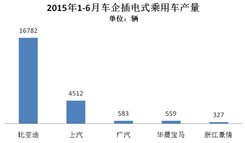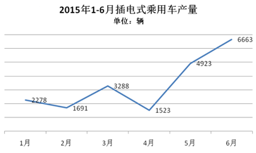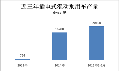 2015年1-6月,插電式混合動力乘用車生產2.04萬輛,同比增長4倍。插電式乘用車在所有新能源車型中增長速度最快。