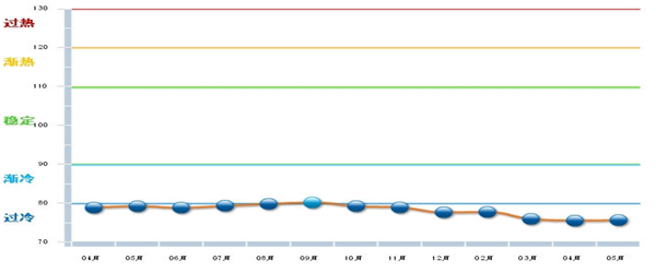圖1 2014.4—2015.05電池行業主營業務收入景氣指數變化態勢